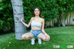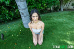 Reyna Belle starts the gallery with her face smeared in cum, gripping a throbbing cock. She gets railed doggy style on the couch, dark hair swaying, pink nails digging in as her real boobs swing and hairy-chested stud slams her wet pussy from behind. Straddling him in red crop top, no panties, she rides his big dick cowgirl, legs spread wide, guiding it deep. Missionary follows, top yanked down exposing brown nipples, him holding her leg to thrust balls-deep. He eats her juicy vulva hungrily. Back to sloppy head, her pink nails stroking shaft in red top and white skirt. Teases topless in jean shorts and sneakers on grass, lifts tube top on bed, strips nude for all-fours ass spread and pink panty leg-play before full-on fucking frenzy.