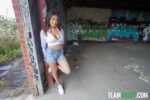 Reyna Belle, stunning brunette Latina with long dark hair, hoop earrings, pink nails, and tattooed arm, starts nude kneeling for close-up di…