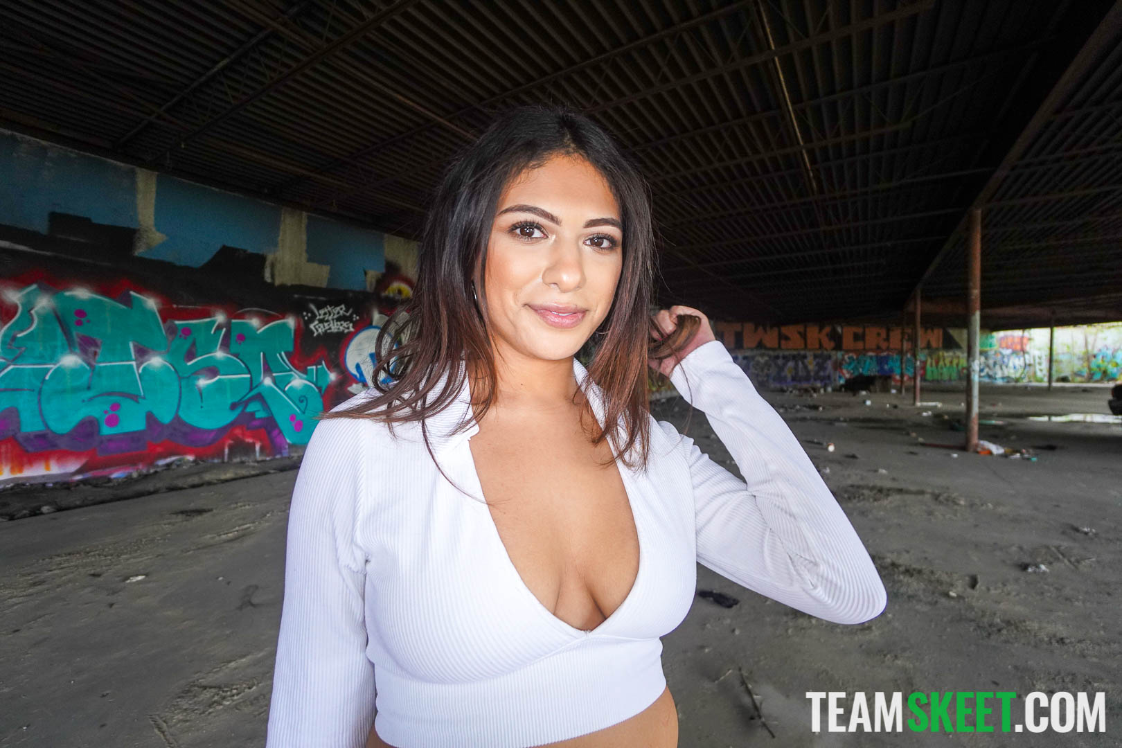 Reyna Belle, stunning brunette Latina with long dark hair, hoop earrings, pink nails, and tattooed arm, starts nude kneeling for close-up dick sucking gaze. She spreads legs on white bed for deep missionary pussy penetration, nipples hard on medium natural tits. Bent over, her full round booty jiggles as stud in black shorts rails her wet slit from behind, hands spreading cheeks. On all fours, he grips her big ass for doggy pounding. Prone bone with buttocks raised, legs held wide for more thrusting. Flashes back to clothed tease in white crop top and denim shorts, pulling top down to expose boobs before sloppy oral on throbbing cock near open mouth. Intense vaginal fucking builds to facial cumshot.